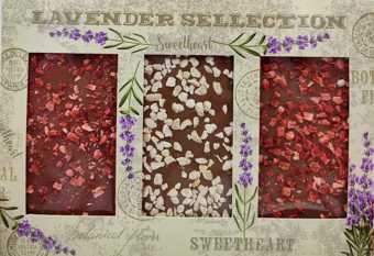 Dárkové balení tří kusů mléčných čokolád s posypem jahod a mandlí.