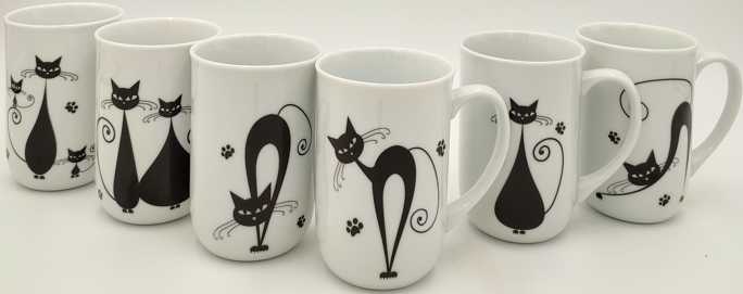 Sada šesti kusů bílých hrnečků s motivem černých koček. Na každém hrnečku je jiný motiv kočky na jedné straně. Na druhé straně hrnečku je černá pacička.