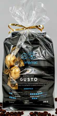 Složení balíčku: Káva Espresso Gusto zrnková 250 g, mléčná čokoláda s mandlovým posypem 96 g, pralinky z mléčné čokolády plněné lískooříškovým krémem 6 kusů.